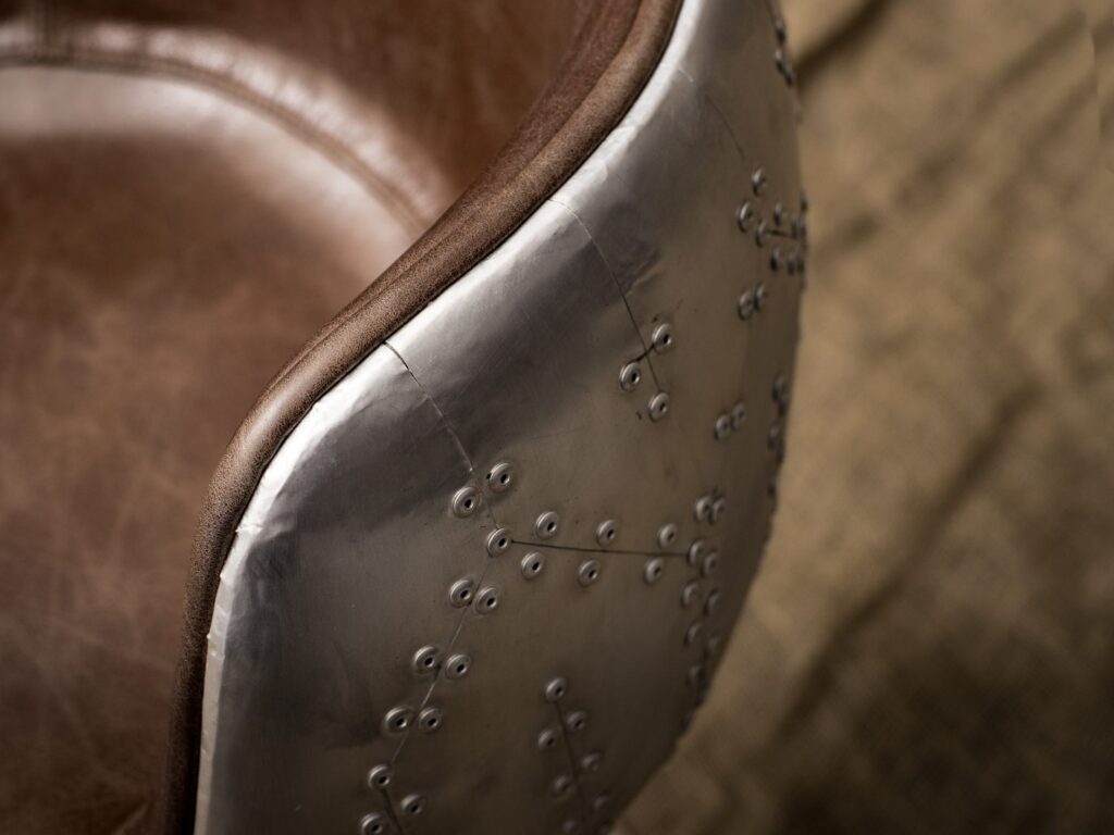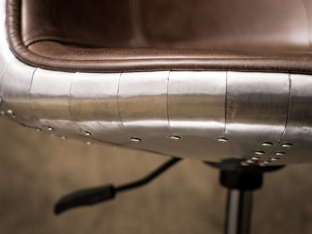 С прочным металлическим каркасом и устойчивыми ножками из нержавеющей стали, этот стул гарантирует максимальную стабильность и долговечность. Уникальная отделка из алюминия придаёт ему современный, винтажный вид, который замечательно впишется в любой loft-стиль.