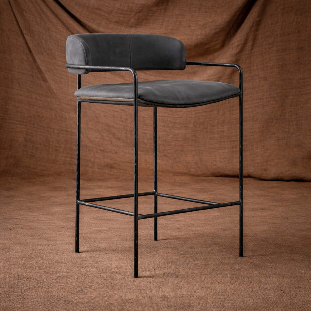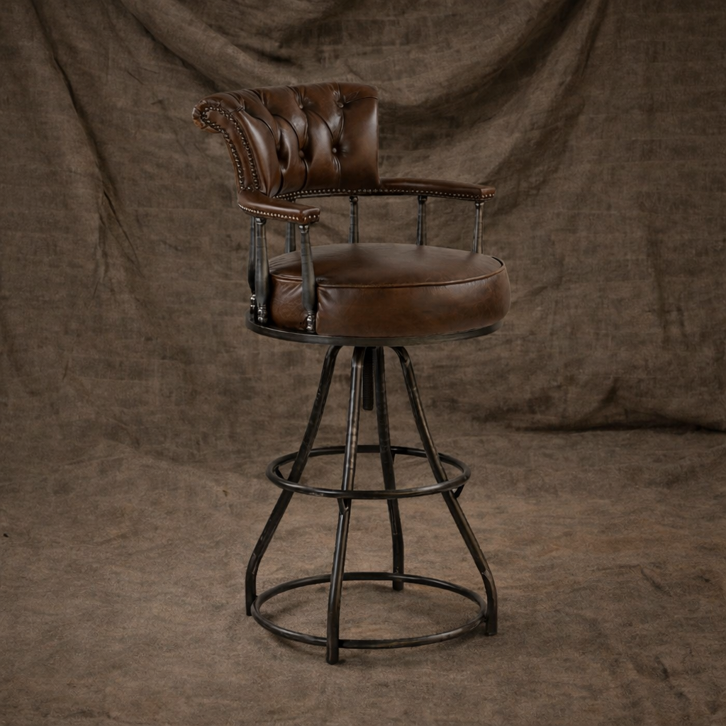 С основанием из прочного железа, этот стул обеспечивает невероятную устойчивость и долговечность. Его обивка выполнена из коровьей кожи top grain, которая не только приятно на ощупь, но и устойчива к износу, добавляя элегантности и роскоши в ваш интерьер.