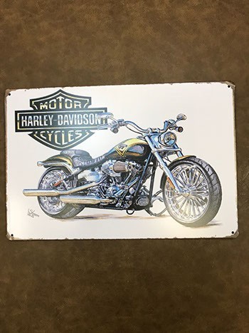 Винтажная жестяная картина с изображением легендарного мотоцикла символизирует свободу, которую можно почувствовать за рулем мчащегося Харлей Дэвидсон. Красочное изображение мотоцикла прорисовано в мельчайших деталях, а углы рамки искусственно состарены. Американские бары не обходились без таких жестяных вывесок, которыми сейчас украшают барбершопы, бары и рестораны. В оформлении квартиры-студии жестяные картины можно использовать в прихожей или обеденной зоне.