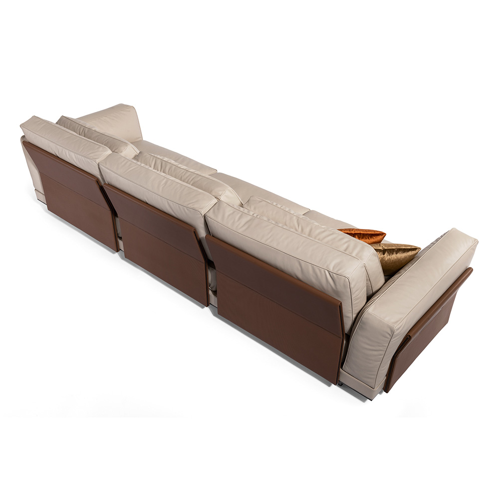 Конструкция дивана основана на прочной раме из массива сосны, что обеспечивает долговечность и надежность. Стильные матовые ножки, выполненные из нержавеющей стали и титана, добавляют современный акцент и повышают устойчивость.