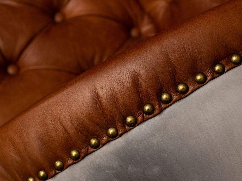 — Изысканная отделка: Диван выполнен на прочном металлическом каркасе, украшенном изысканной алюминиевой отделкой и латунными гвоздиками, которые добавляют нотки индустриального шика и стилевой оригинальности.