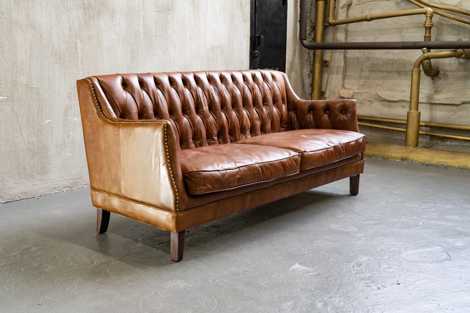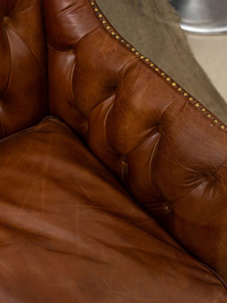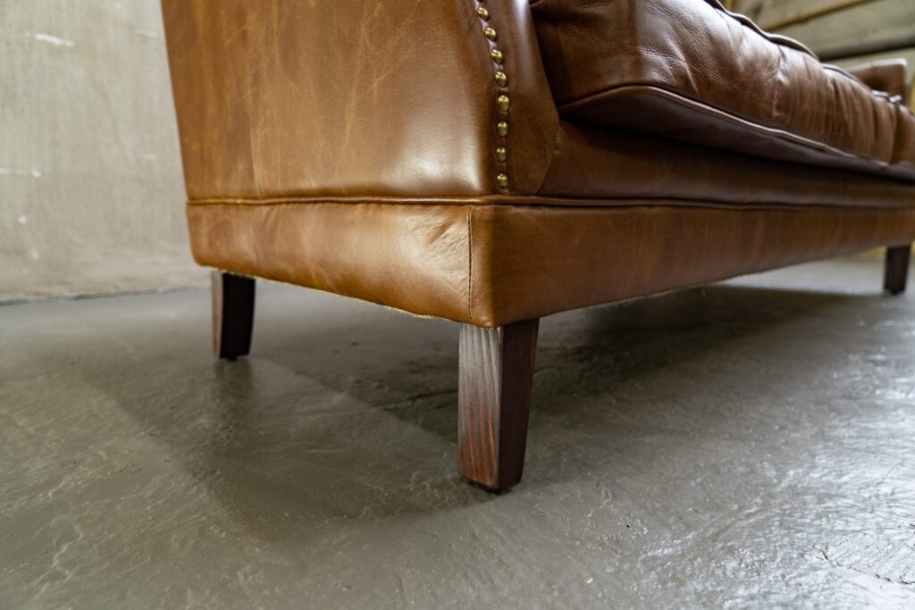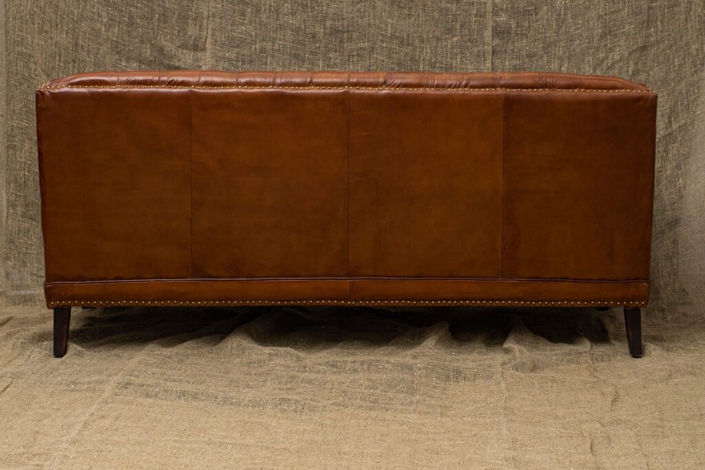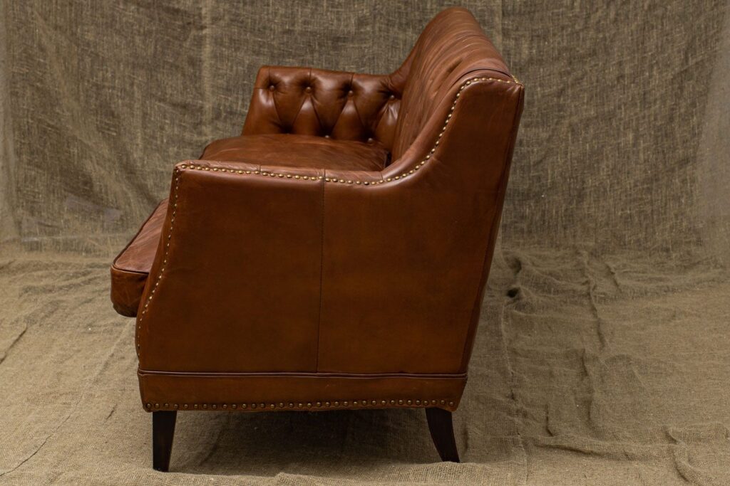 Сочетание прочного каркаса из лиственницы и массивных деревянных ножек обеспечивает надежность и долговечность, а обивка из высококачественной коровьей кожи Top Grain дарит ощущение роскоши и уюта. Искусно отделанный латунными гвоздиками, этот диван не только комфортен, но и привлекает внимание своим изысканным дизайном.