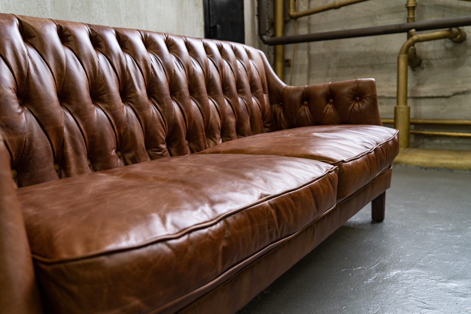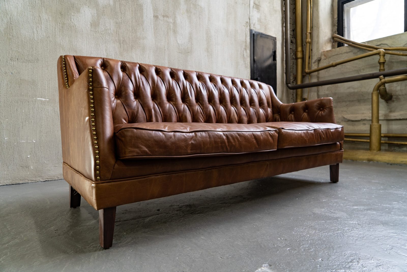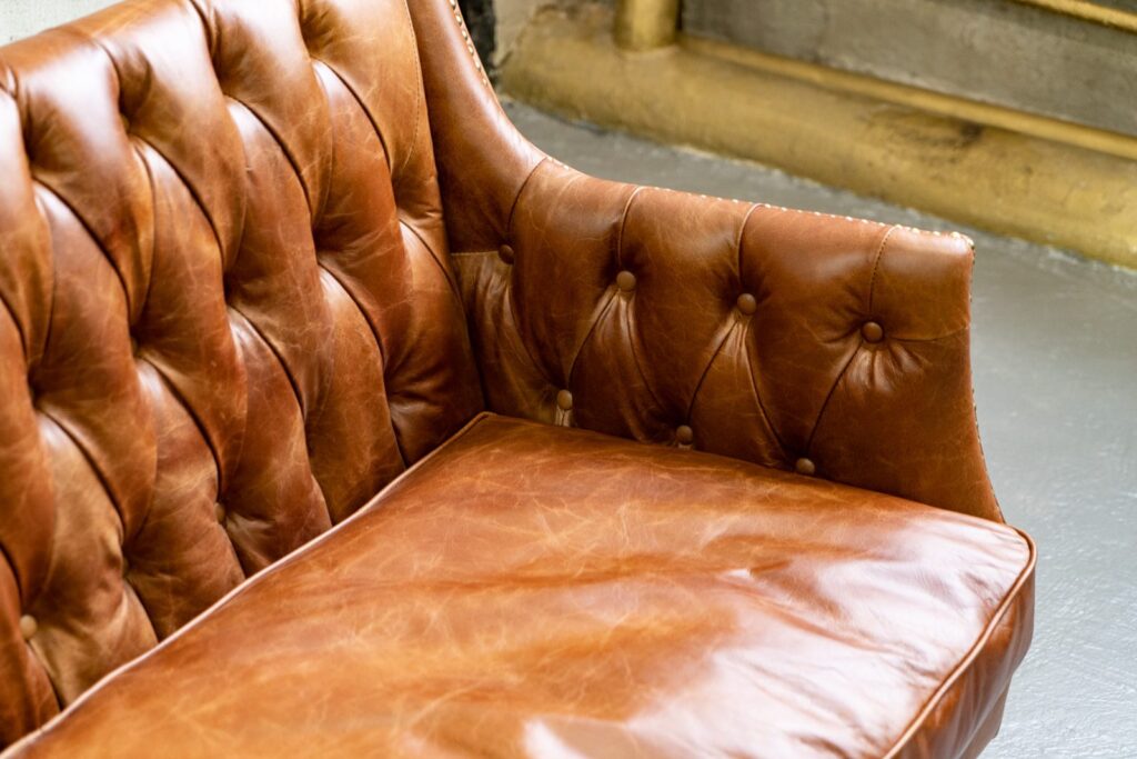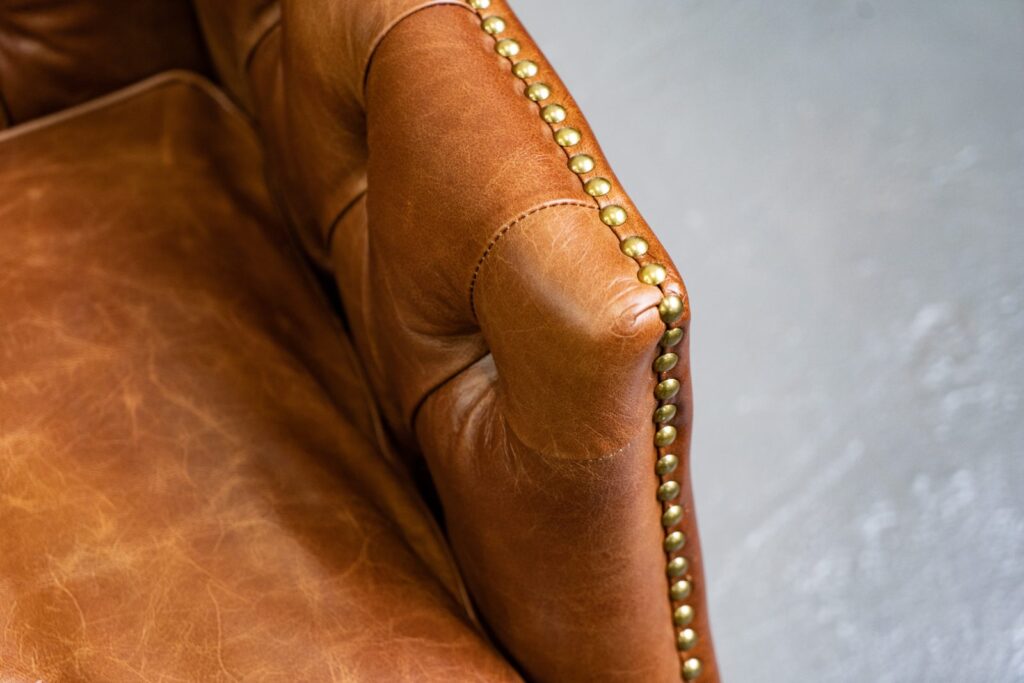 Сочетание прочного каркаса из лиственницы и массивных деревянных ножек обеспечивает надежность и долговечность, а обивка из высококачественной коровьей кожи Top Grain дарит ощущение роскоши и уюта. Искусно отделанный латунными гвоздиками, этот диван не только комфортен, но и привлекает внимание своим изысканным дизайном.