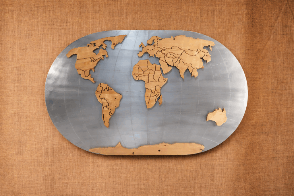 Карта гармонично дополнит интерьер с утилитарной мебелью и кожаным диваном «Честерфилд».