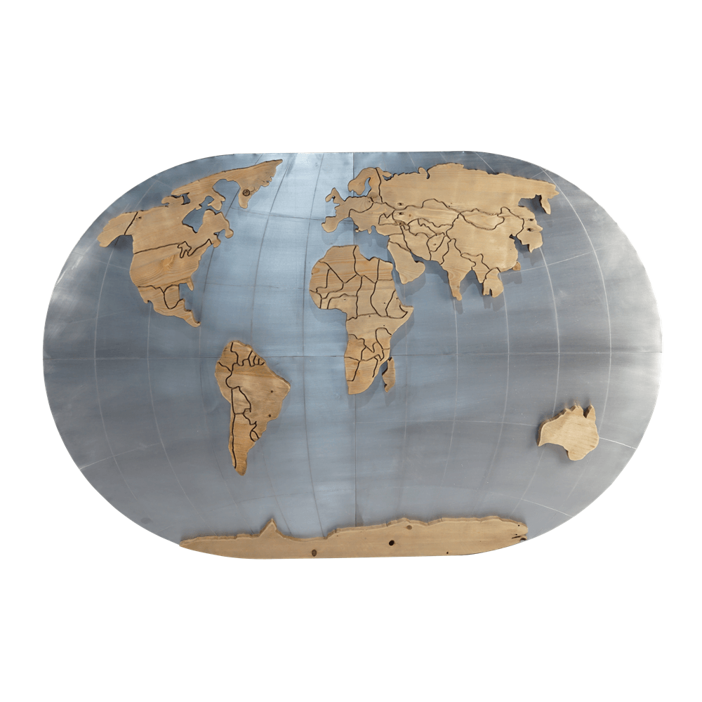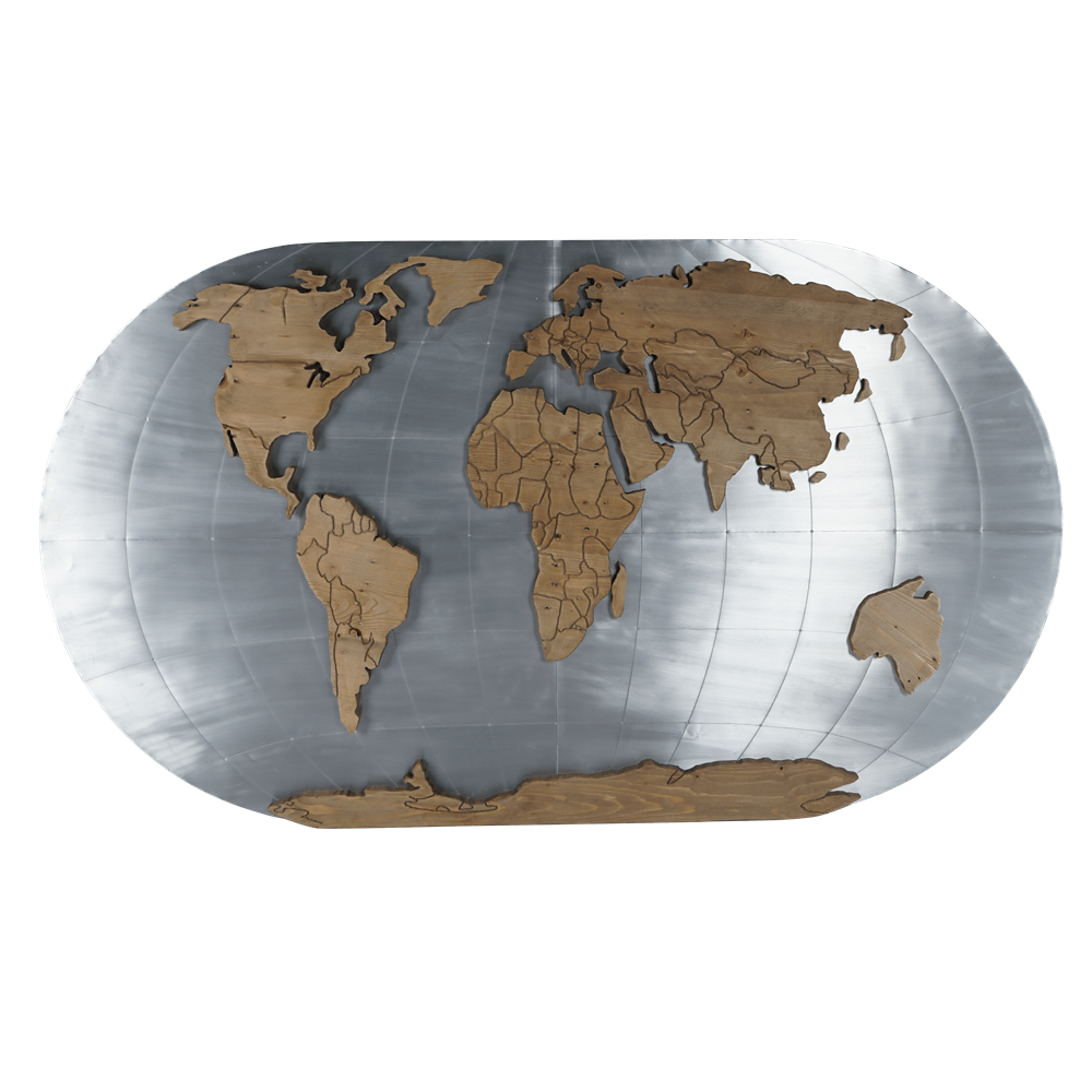 Макет географической карты на алюминиевом полотне с материками и островами, выточенными из слэба дерева, ― достойное украшение гостиной, стилизованной под то или иное направление.