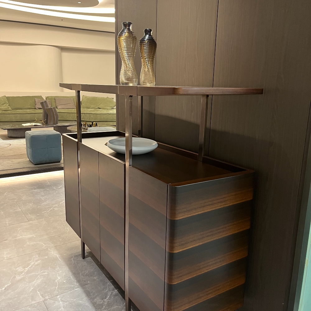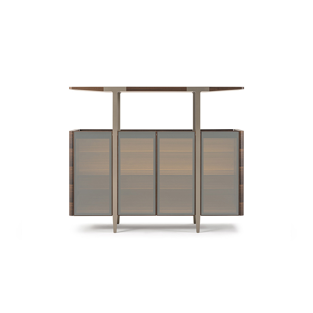 Комод оснащен прочной полкой и закаленным стеклом, обеспечивая надежное место для хранения ваших любимых вещей, книг или декора. Элегантные ножки из нержавеющей стали с бронзовой полировкой придают изделию современный вид и гарантируют устойчивость, создавая гармоничный баланс между стилем и функциональностью.