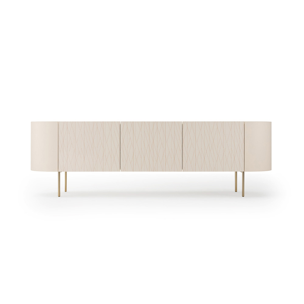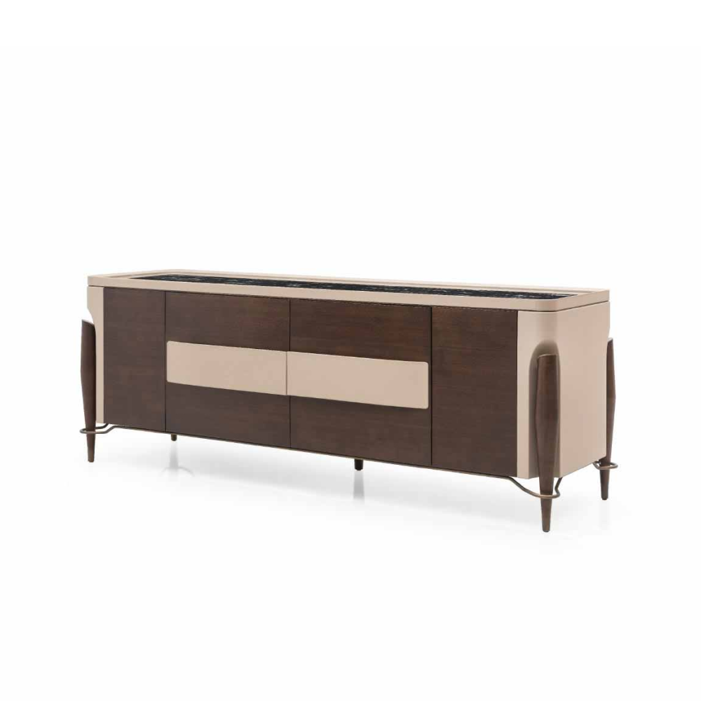 Комод стильно дополняют ножки из нержавеющей стали с бронзовой полировкой, придающие изделию современный вид и дополнительную устойчивость. Закаленное стекло придает комоду изысканность и защищает содержимое от пыли, сохраняя его всегда в идеальном состоянии.