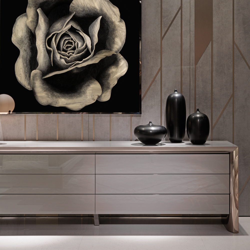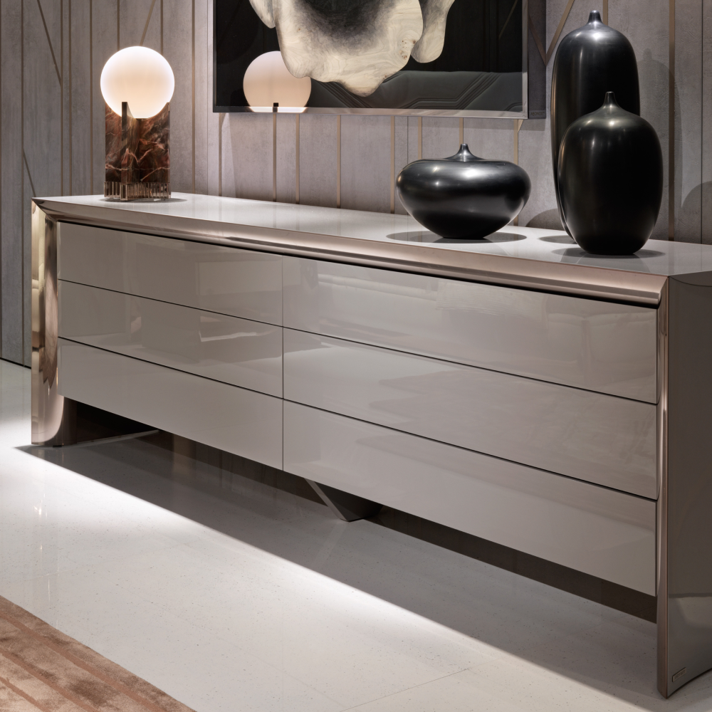 — Эстетика и стиль: Рамка из матового титана из нержавеющей стали придаёт комоду современный и элегантный вид, который станет ярким акцентом любой комнаты.