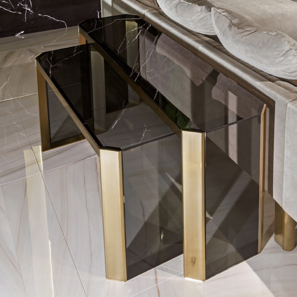 Изготовленная из закаленного серого стекла, она не только придаёт пространству современный вид, но и обеспечивает невероятную прочность и долговечность. Ножки из нержавеющей стали с матовой титановой отделкой добавляют роскошный акцент, идеально сочетая современный стиль с высокими стандартами качества.