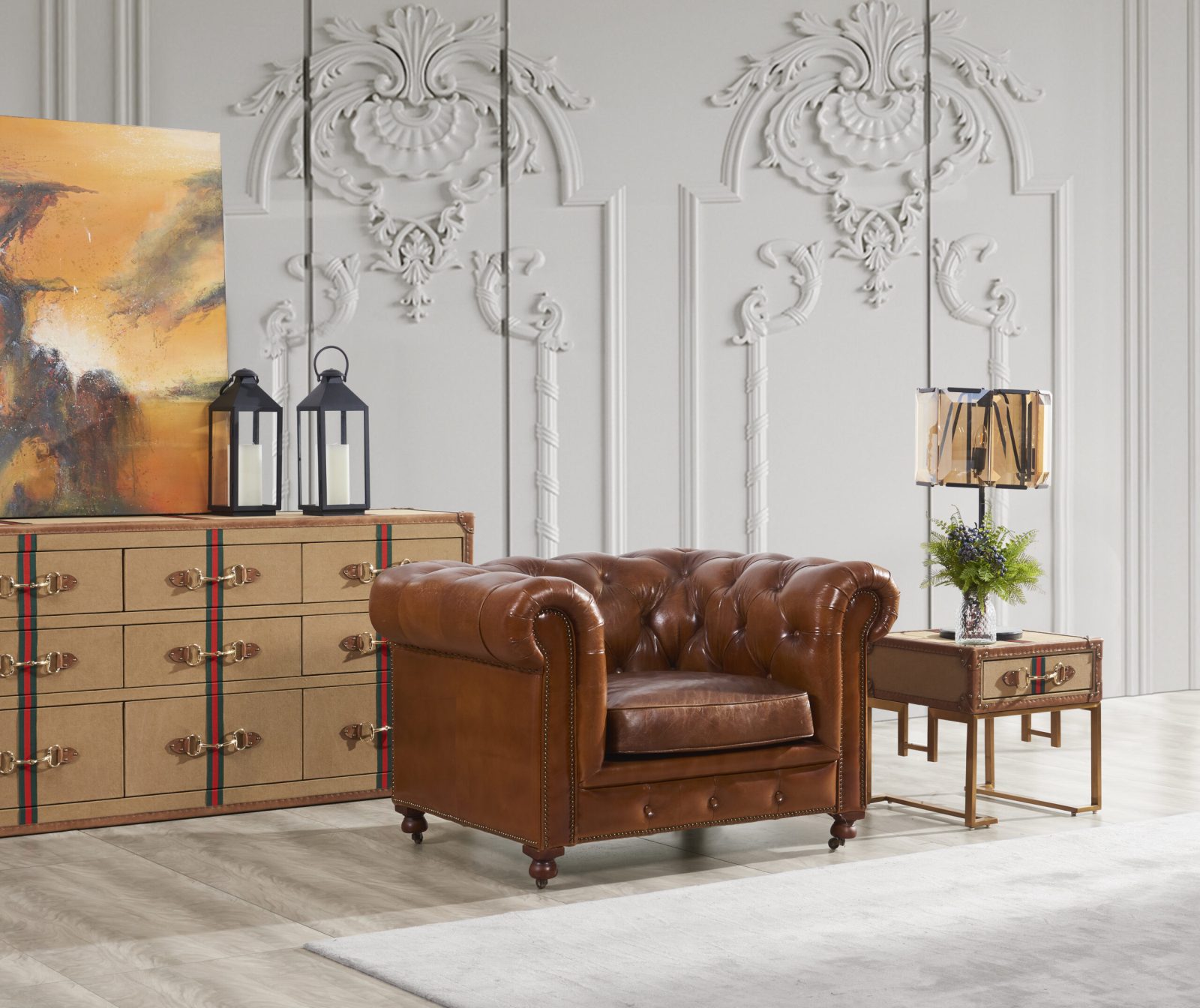 — Роскошные материалы: Каркас кресла из лиственницы обеспечивает прочность, а массив дерева в ножках добавляет устойчивости и элегантности. Обивка из коровьей кожи top grain придаёт креслу уникальный характер и ощущение комфорта.