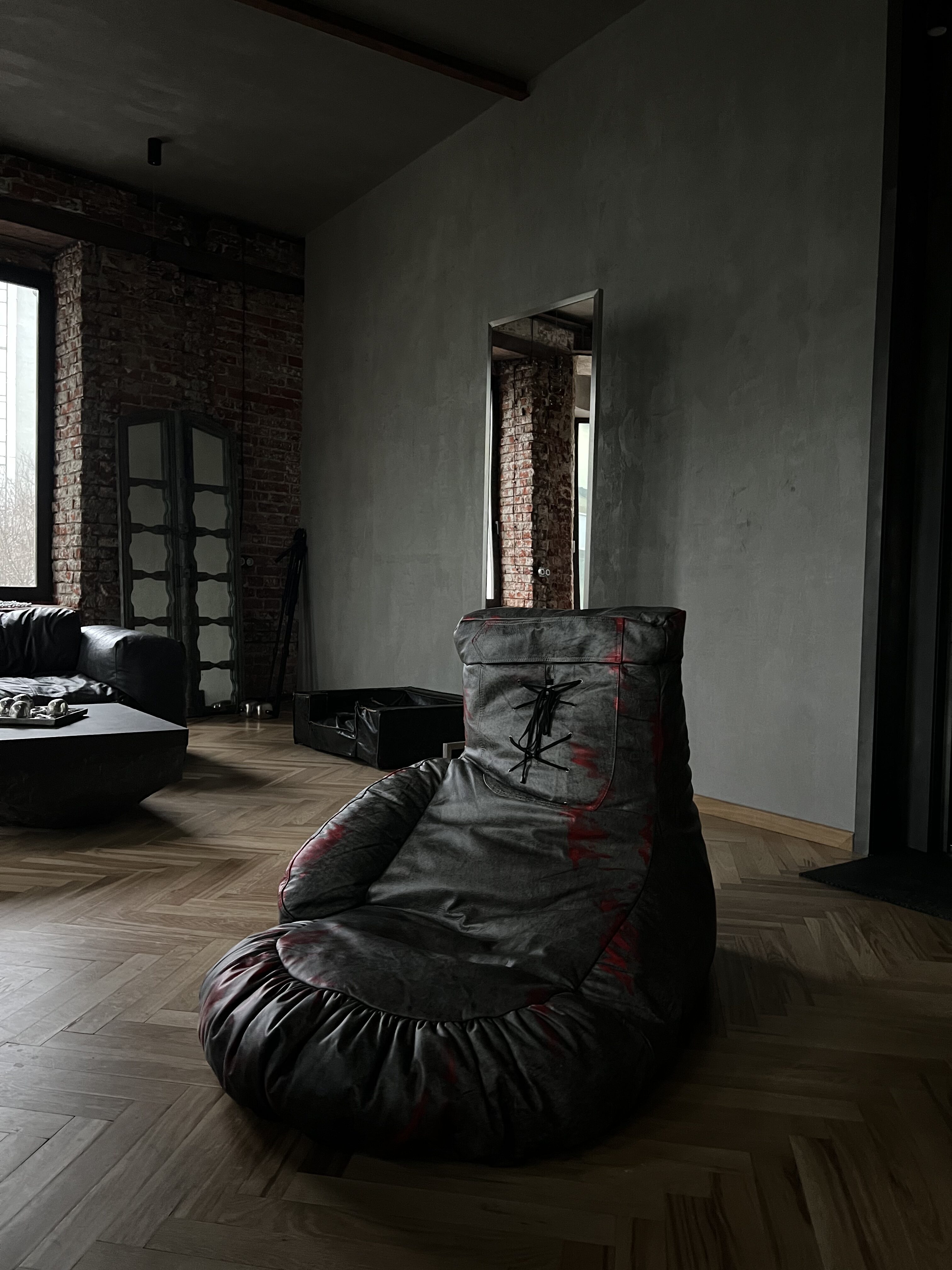 Фактурная обивка с эффектом состаренного материала подчёркивает эстетику грубой индустрии, а контрастные швы добавляют визуальной силы и акцента.