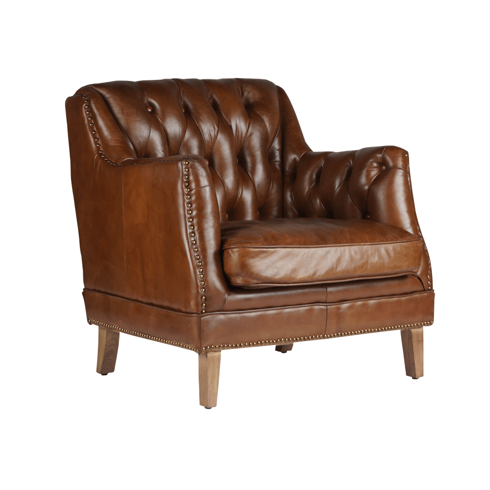 Каркас кресла изготовлен из лиственницы, что обеспечивает прочность и долговечность, а массивные деревянные ножки не только надежны, но и придают изделию стильный вид. Обивка из коровьей кожи top grain обещает роскошное ощущение на ощупь и легкость в уходе, а отделка латунными гвоздиками добавляет щепотку шарма и утонченности.