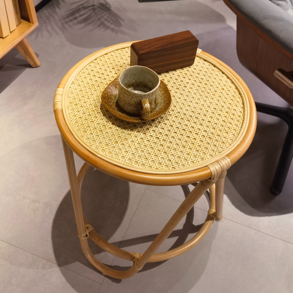 Круглая форма стола создает атмосферу близости и общения, что делает его идеальным выбором для кофе-брейка или вечерних посиделок. Уникальная сетка из ротанга придает аксессуару легкость и изящество, а также добавляет ощущение естественности и уюта.