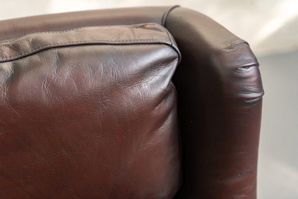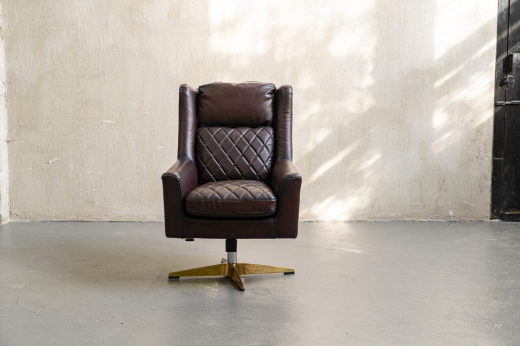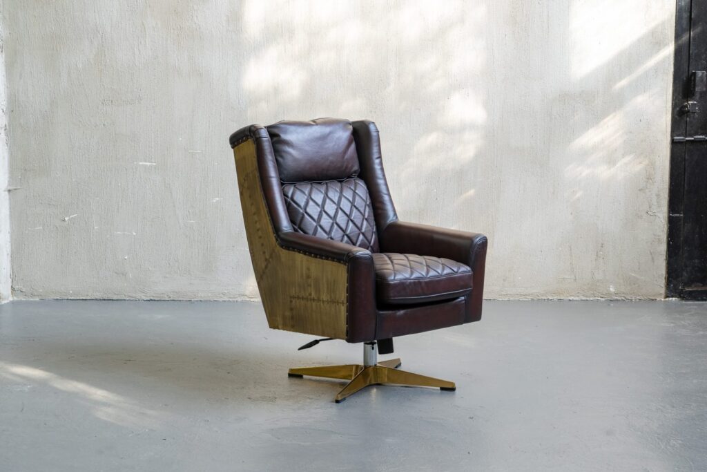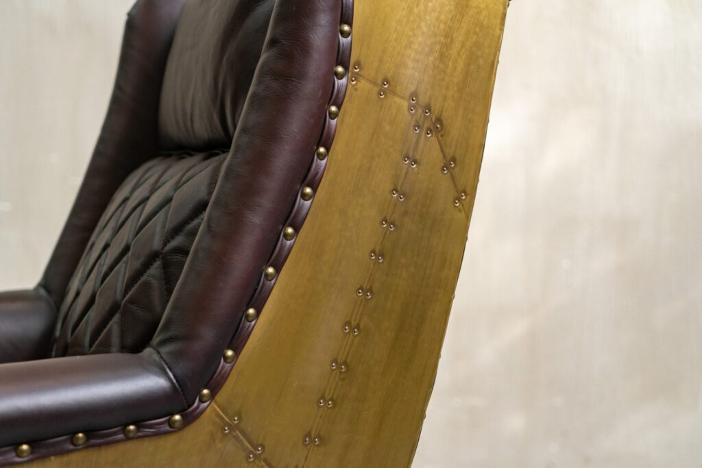— Премиальные материалы: Корпус кресла выполнен из прочного металлического каркаса с нержавеющей стальной ножкой и латунной отделкой, что не только обеспечивает надежность, но и придает изделию современный вид. Обивка из коровьей кожи top grain добавляет роскоши и делает каждую деталь кресла уникальной.