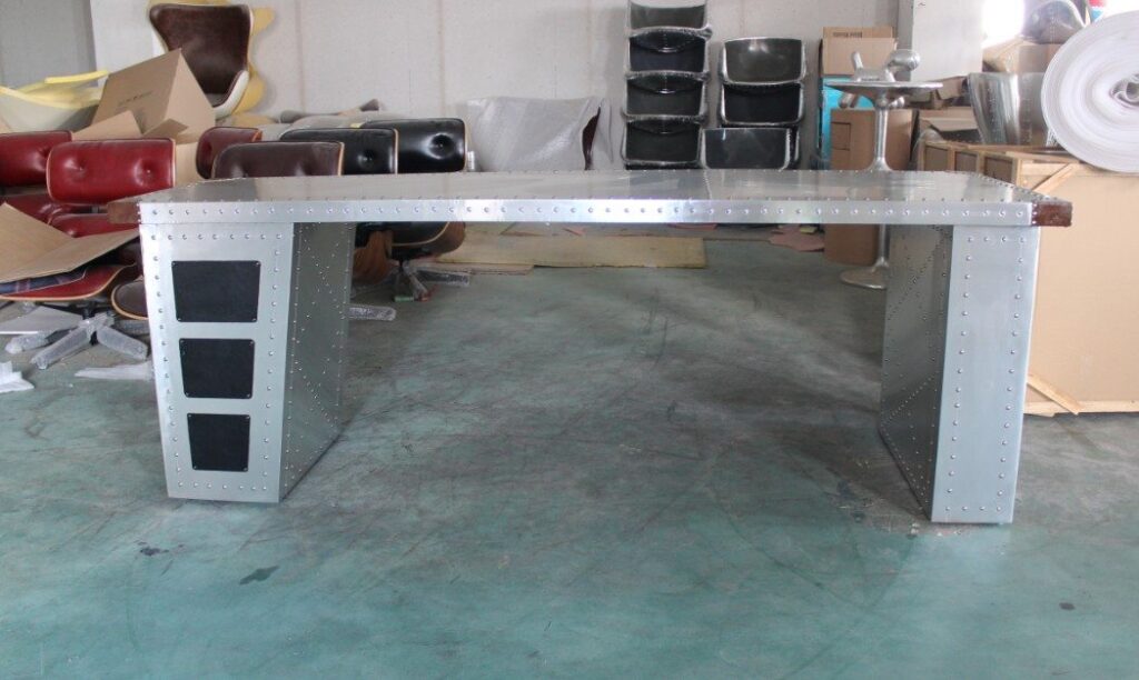 Стильный стол для работы и развлечений изготовлен из дерева и облицован листами полированного алюминия, соединенного методом клепки. Оформление стола олицетворяет отделку исторического истребителя Spitfire, вдохновившего выдающихся дизайнеров на создание мебели в авиационном стиле. С одной стороны форма столешницы не прямая, а слегка закругленная, напоминающая плавный изгиб крыла самолета. Углы стола обтянуты натуральной кожей, цвет которой можно изменить на усмотрение заказчика.