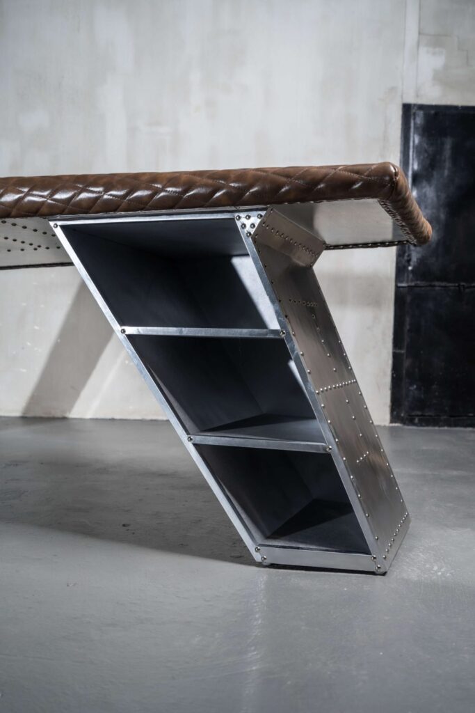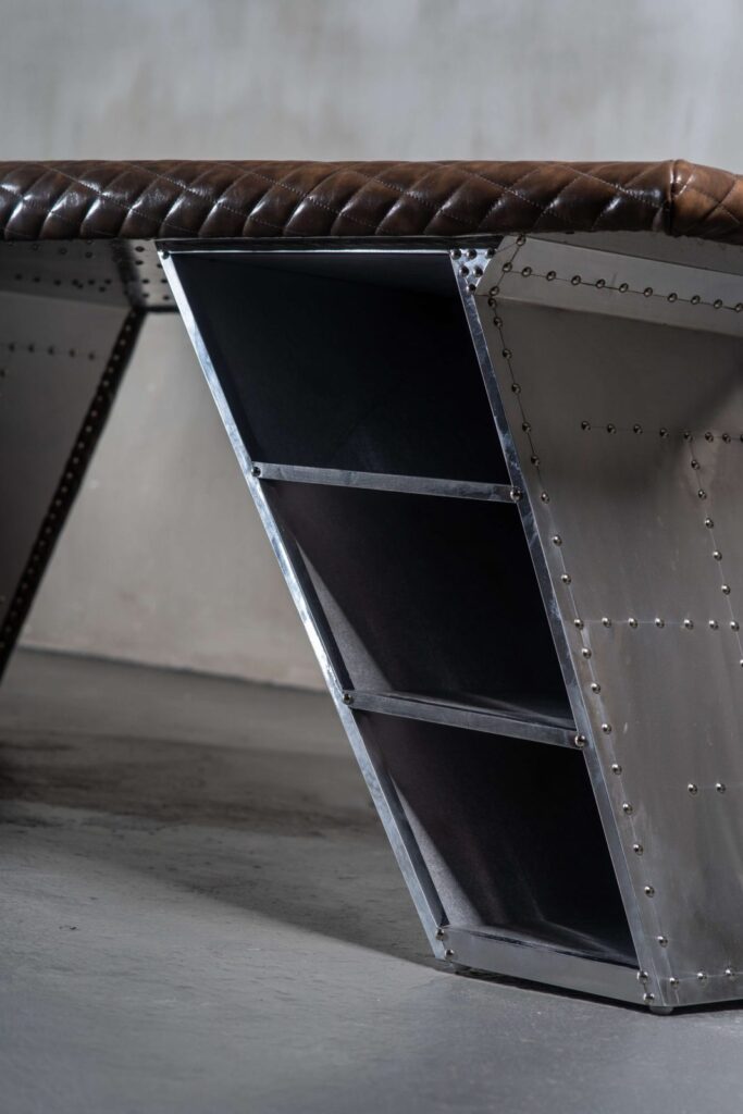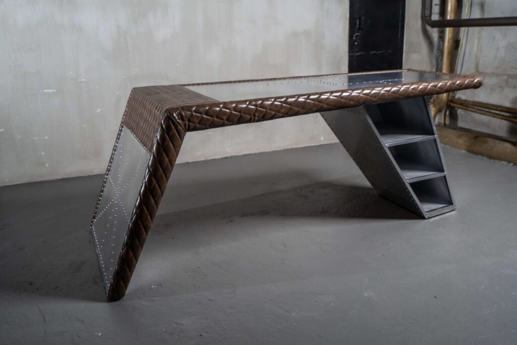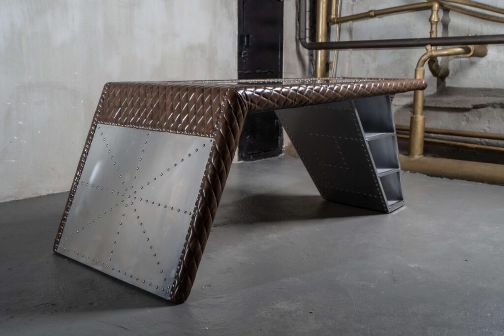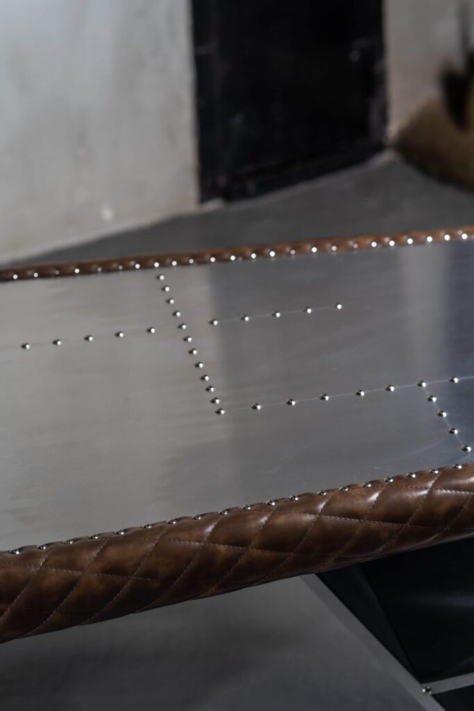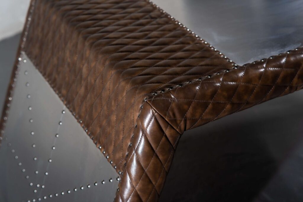 В конструкции стола использованы прочный каркас из лиственницы и элегантные металлические ножки, завершающие образ в отделке из алюминия и кожи. Такой выбор материалов обеспечивает долговечность, а стильный дизайн привносит атмосферу современности и роскоши.