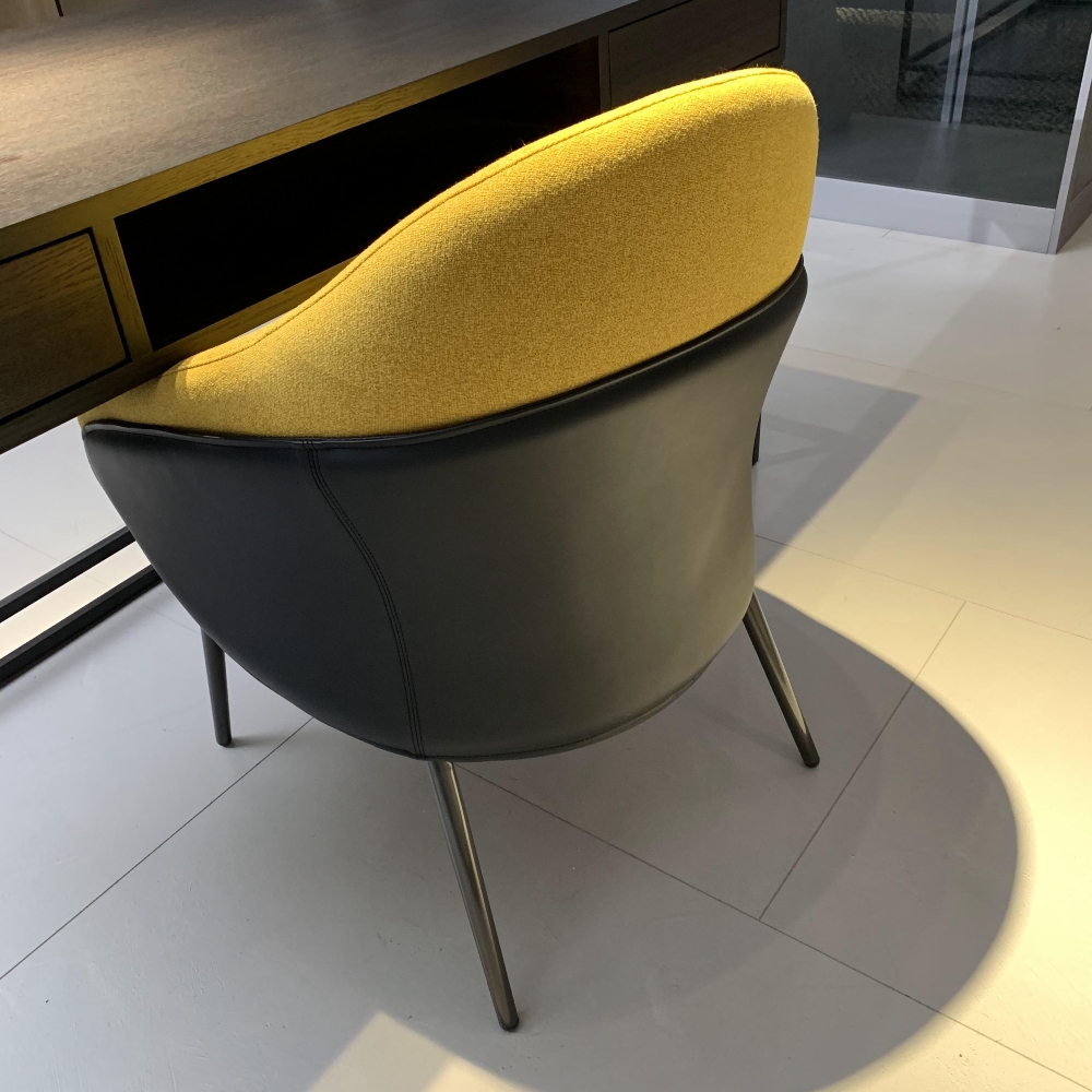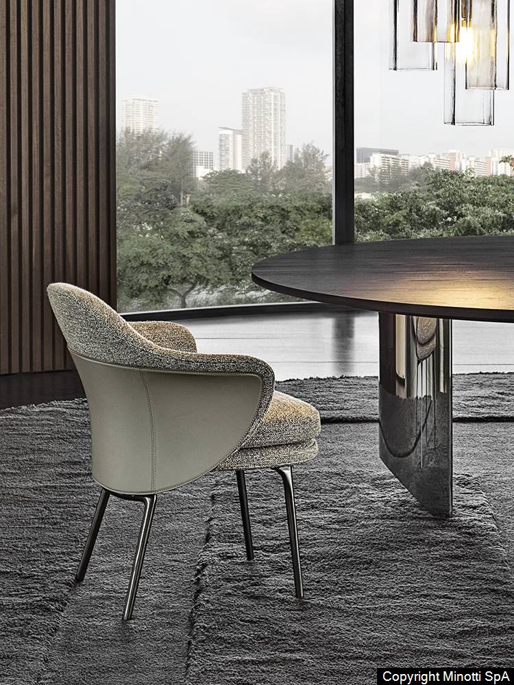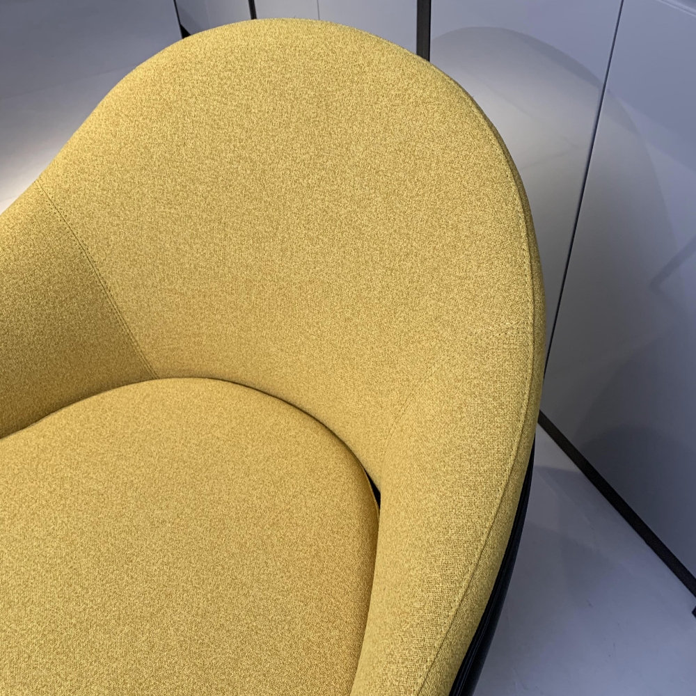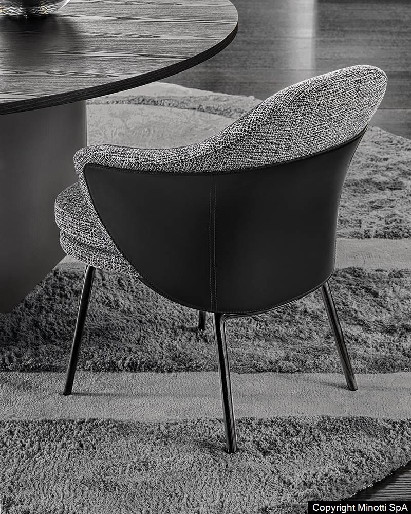 Элемент из кожи образует крыло, охватывающее кресло, поддерживающее каркас, как скульптурное бюст, характеризующееся внутри манящей мягкостью сиденья и спинки. За кажущейся простотой конструкции скрывается передовой технологический процесс изготовления как набивки из пенопласта различной текстуры, так и седловой кожи, изготовленной с использованием двух разных форм Baydur®, которые идеально повторяют изогнутую линию кресла.