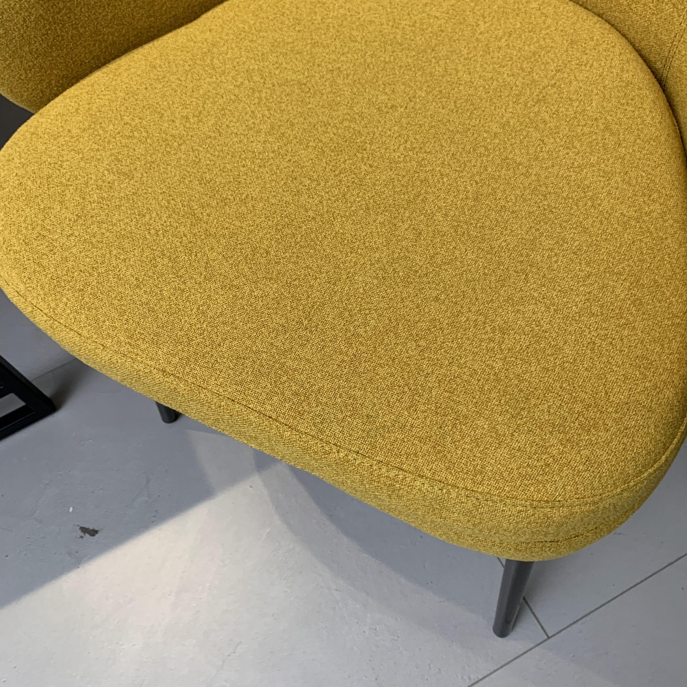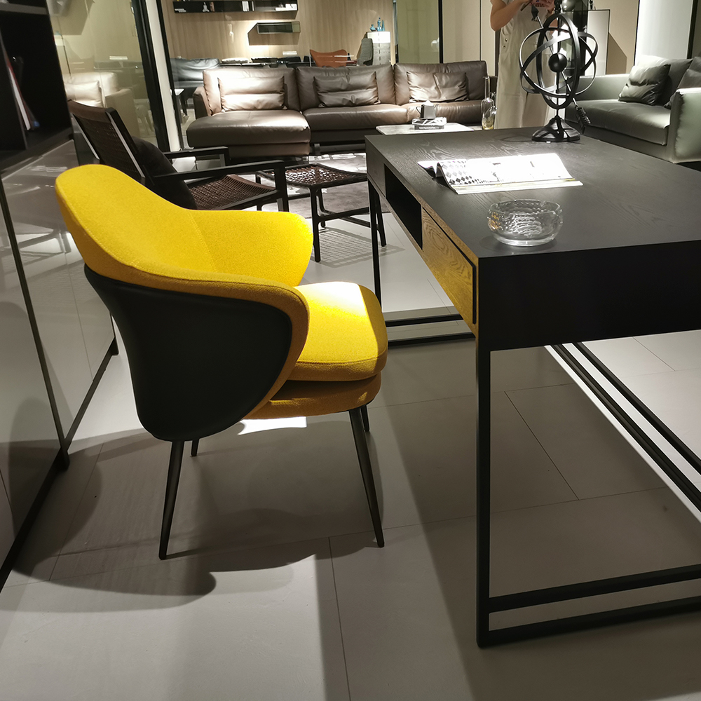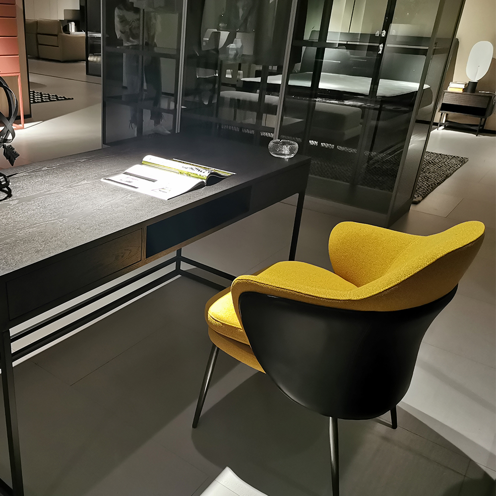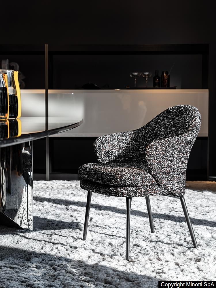 Элемент из кожи образует крыло, охватывающее кресло, поддерживающее каркас, как скульптурное бюст, характеризующееся внутри манящей мягкостью сиденья и спинки. За кажущейся простотой конструкции скрывается передовой технологический процесс изготовления как набивки из пенопласта различной текстуры, так и седловой кожи, изготовленной с использованием двух разных форм Baydur®, которые идеально повторяют изогнутую линию кресла.