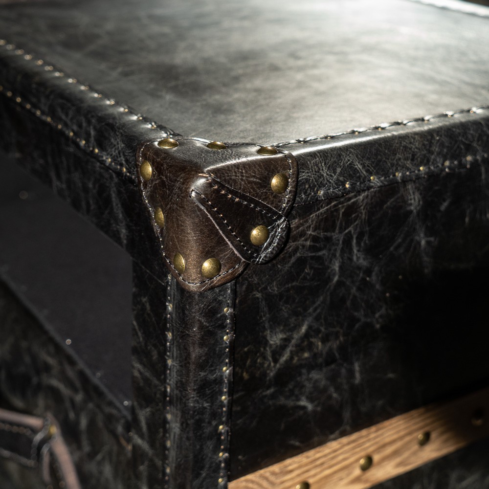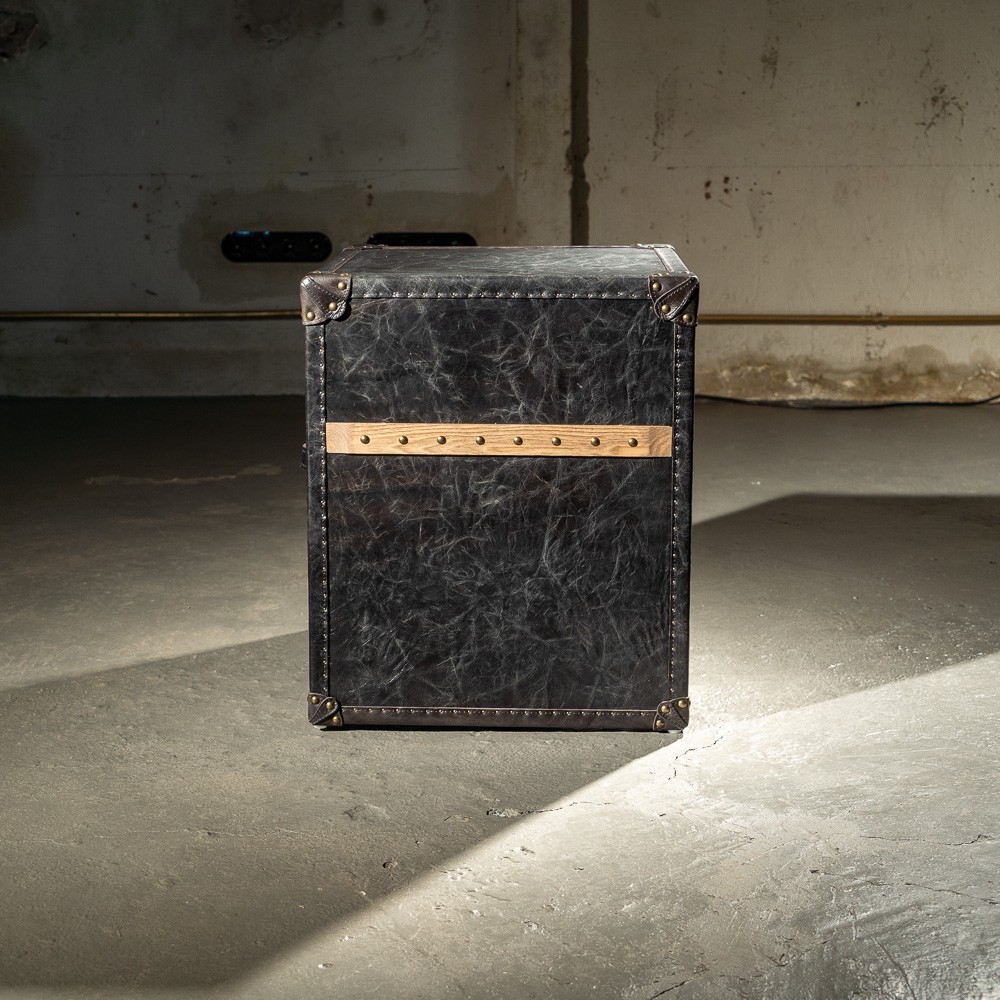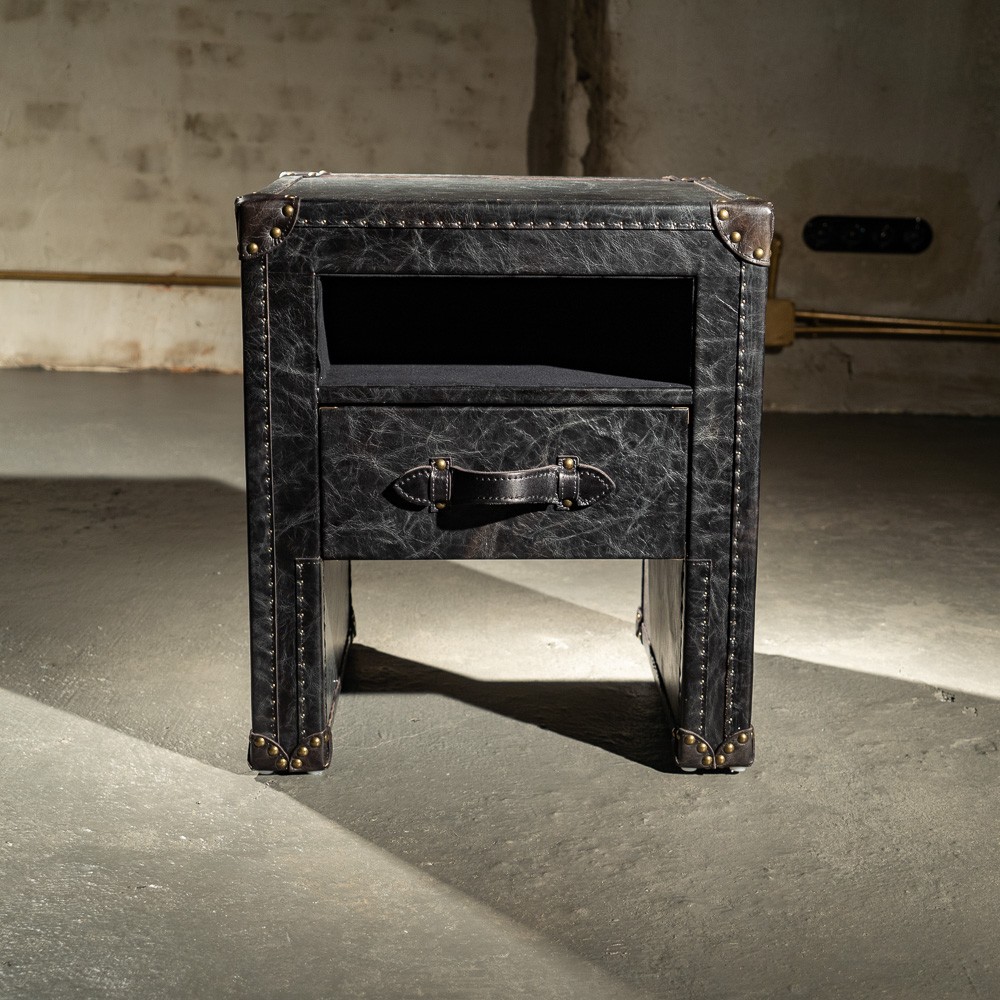 Тумба прямоугольной формы с обивкой из натуральной кожи для любителей необычных вещей. Основная дизайнерская задумка заключается в том, чтобы оставить привычные элементы сундука, но придать изделию большую функциональность. Гладкая, приятная на ощупь поверхность позволяет использовать предмет мебели в качестве прикроватного столика, тумбы в прихожей или гостиной. Предусмотрен небольшой выдвижной ящик для мелочей с кожаной ручкой. В качестве декора выбраны латунные накладки и клепки. Ножками служат цельные боковые панели.