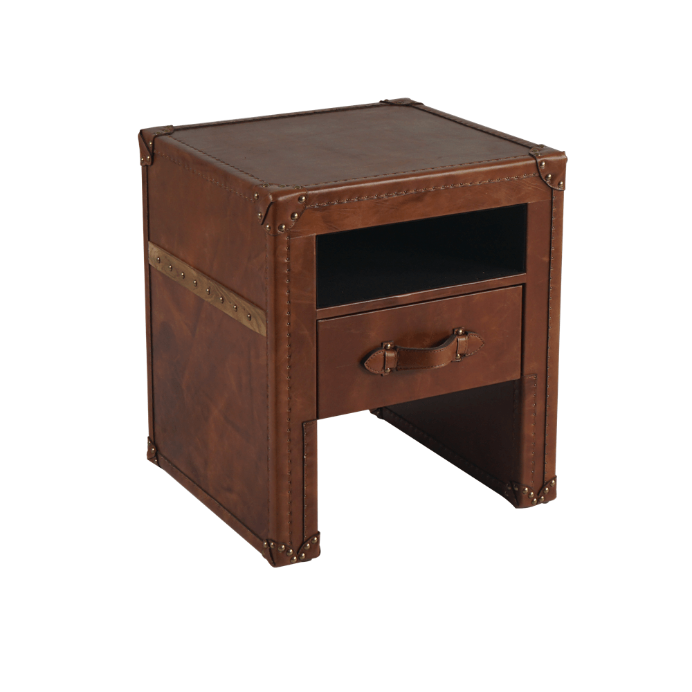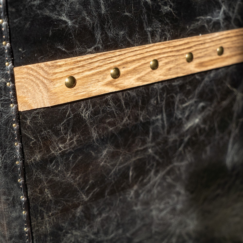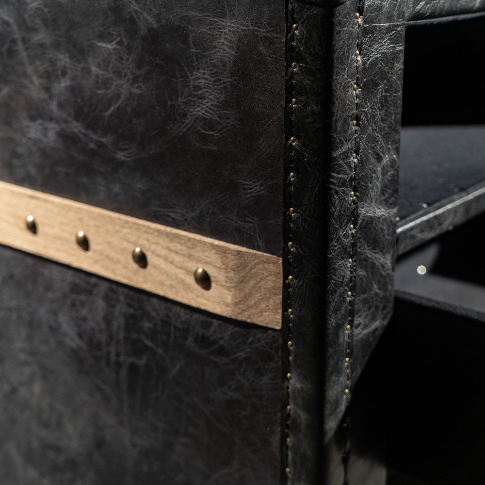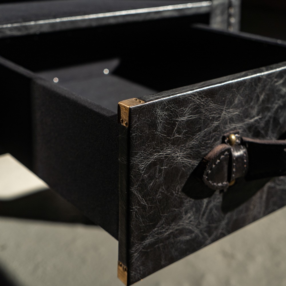 Тумба прямоугольной формы с обивкой из натуральной кожи для любителей необычных вещей. Основная дизайнерская задумка заключается в том, чтобы оставить привычные элементы сундука, но придать изделию большую функциональность. Гладкая, приятная на ощупь поверхность позволяет использовать предмет мебели в качестве прикроватного столика, тумбы в прихожей или гостиной. Предусмотрен небольшой выдвижной ящик для мелочей с кожаной ручкой. В качестве декора выбраны латунные накладки и клепки. Ножками служат цельные боковые панели.