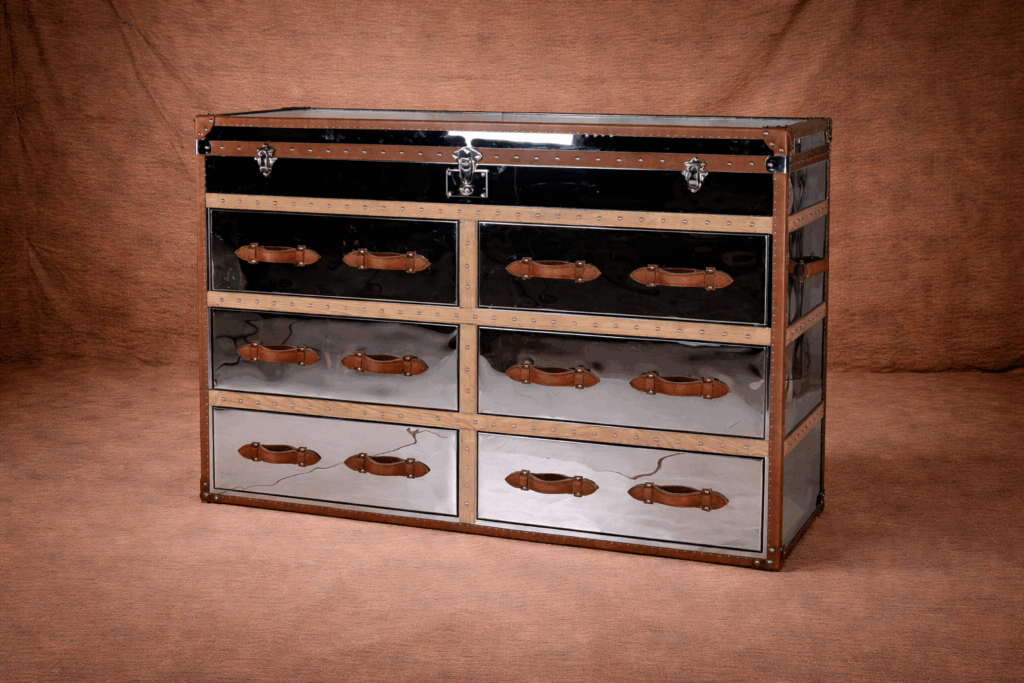 Изготавливаемая из высококачественных материалов, тумба имеет каркас из прочной деревобивки и отделку из полированной нержавеющей стали, что придаёт ей уникальный глянец и долговечность. Нежные кожаные акценты и элементы из массива дерева подчеркивают мастерство изготовления и добавляют текстуры, что делает этот предмет мебели не просто функциональным, но и стильным акцентом в вашем интерьере.