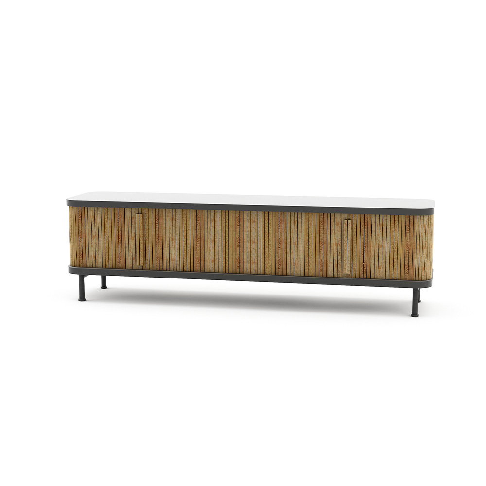Ключевой особенностью этой модели являются декоративные рейки, которые придают тумбе оригинальный вид и создают эффект объема, привлекающий взоры. Углеродистая сталь в конструкции гарантирует долговечность и надежность, а также подчеркивает современный дизайн.
