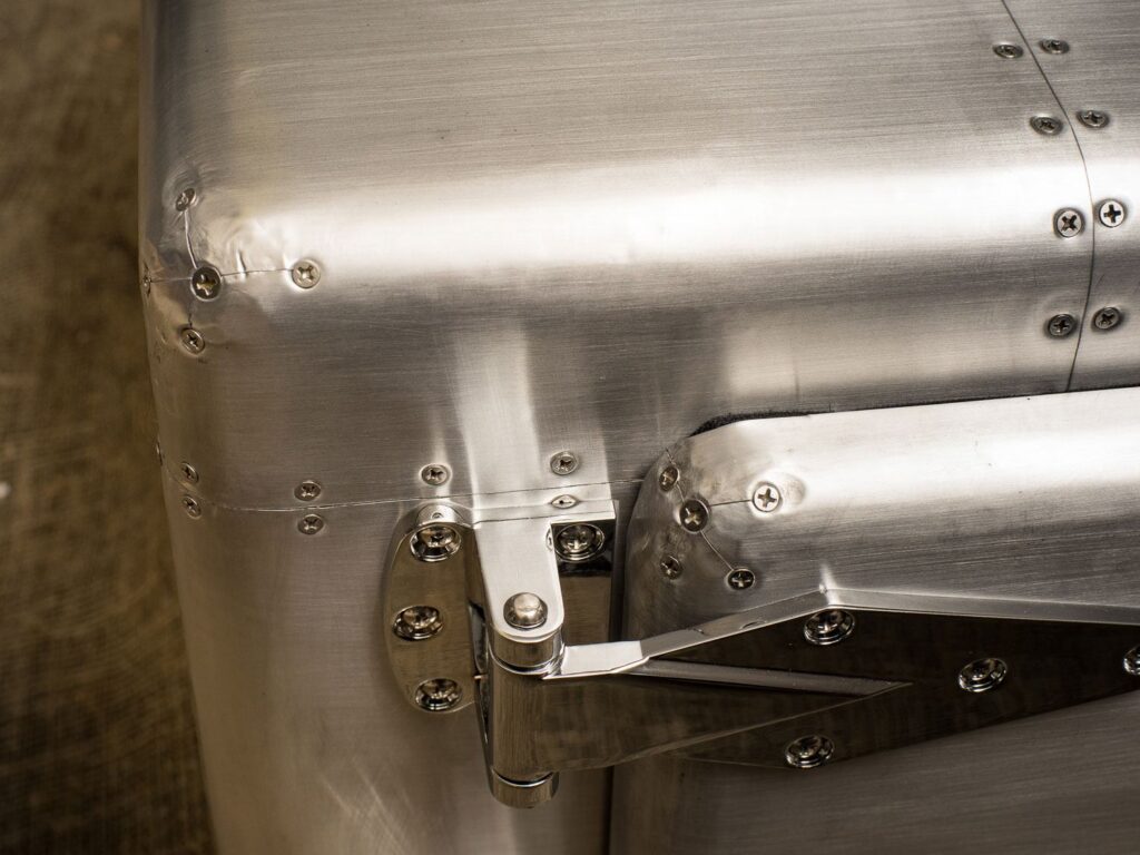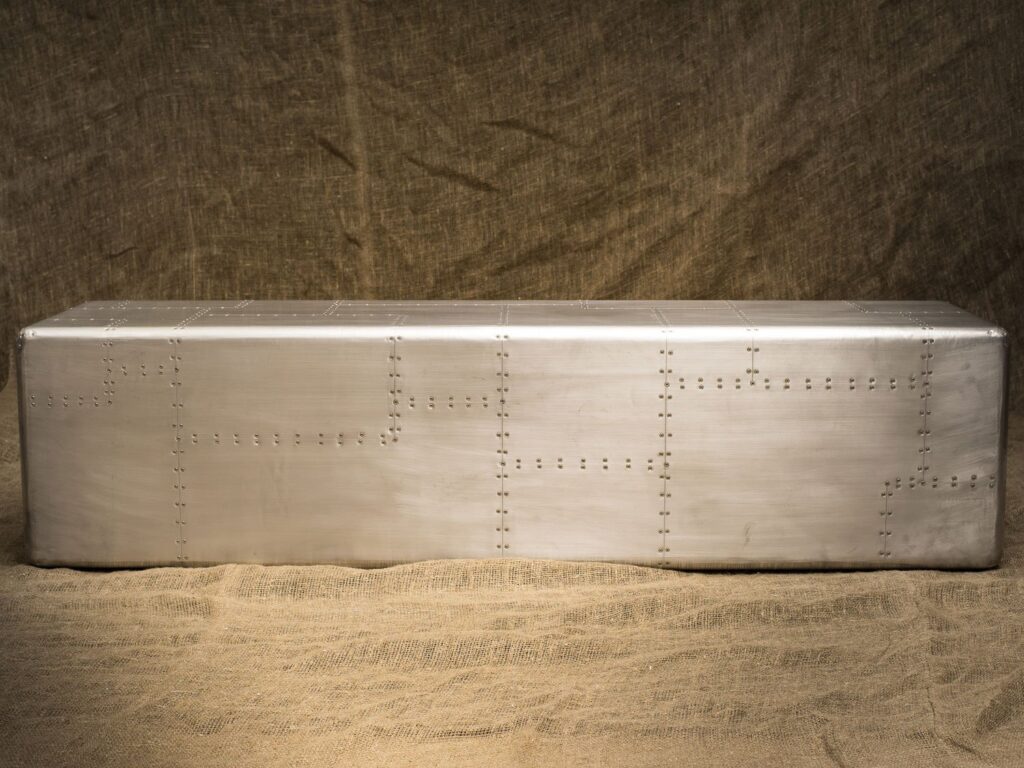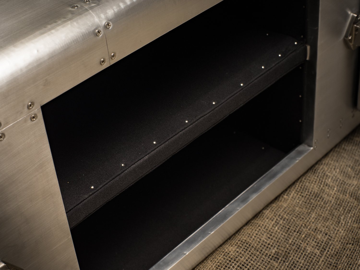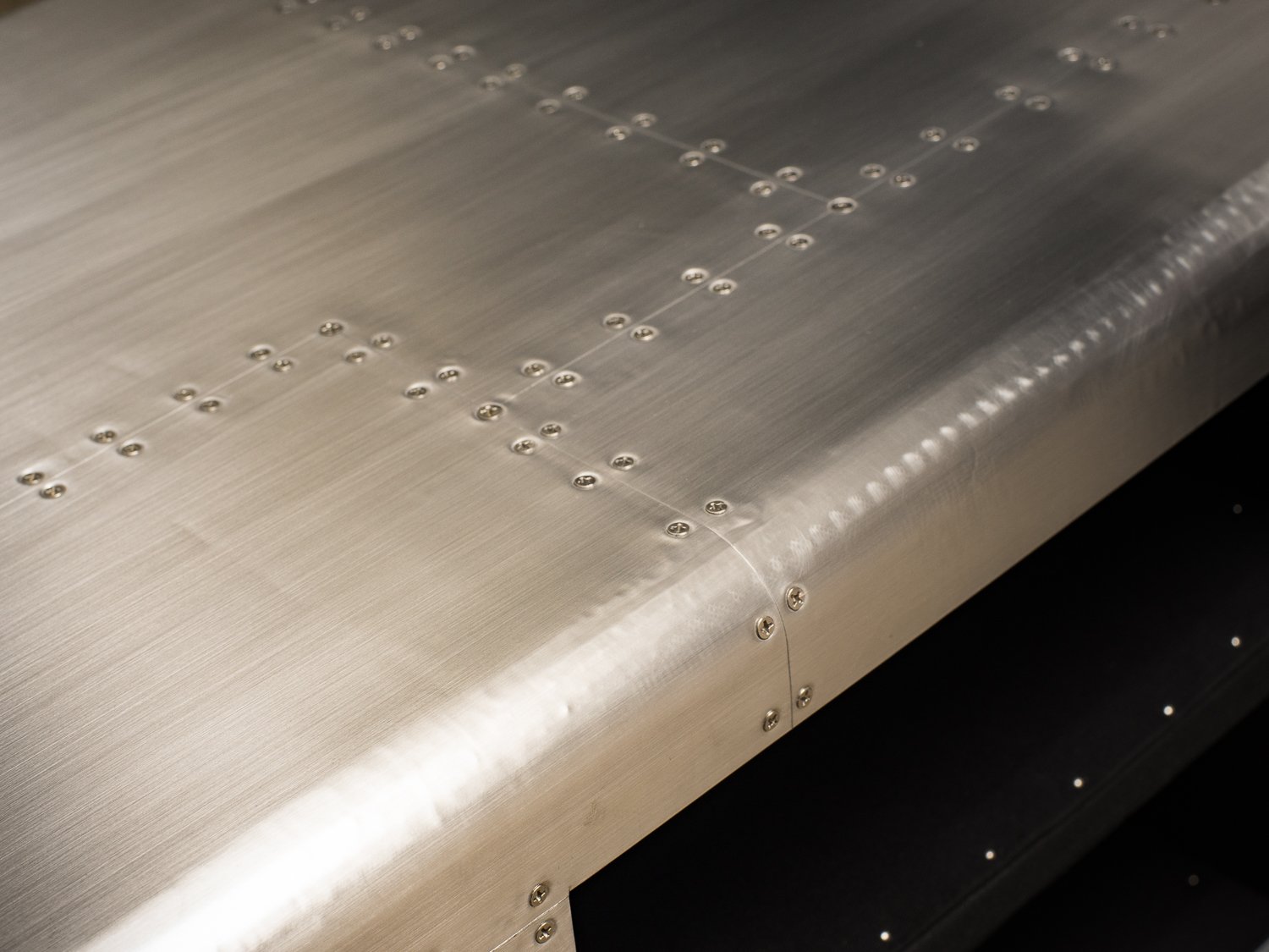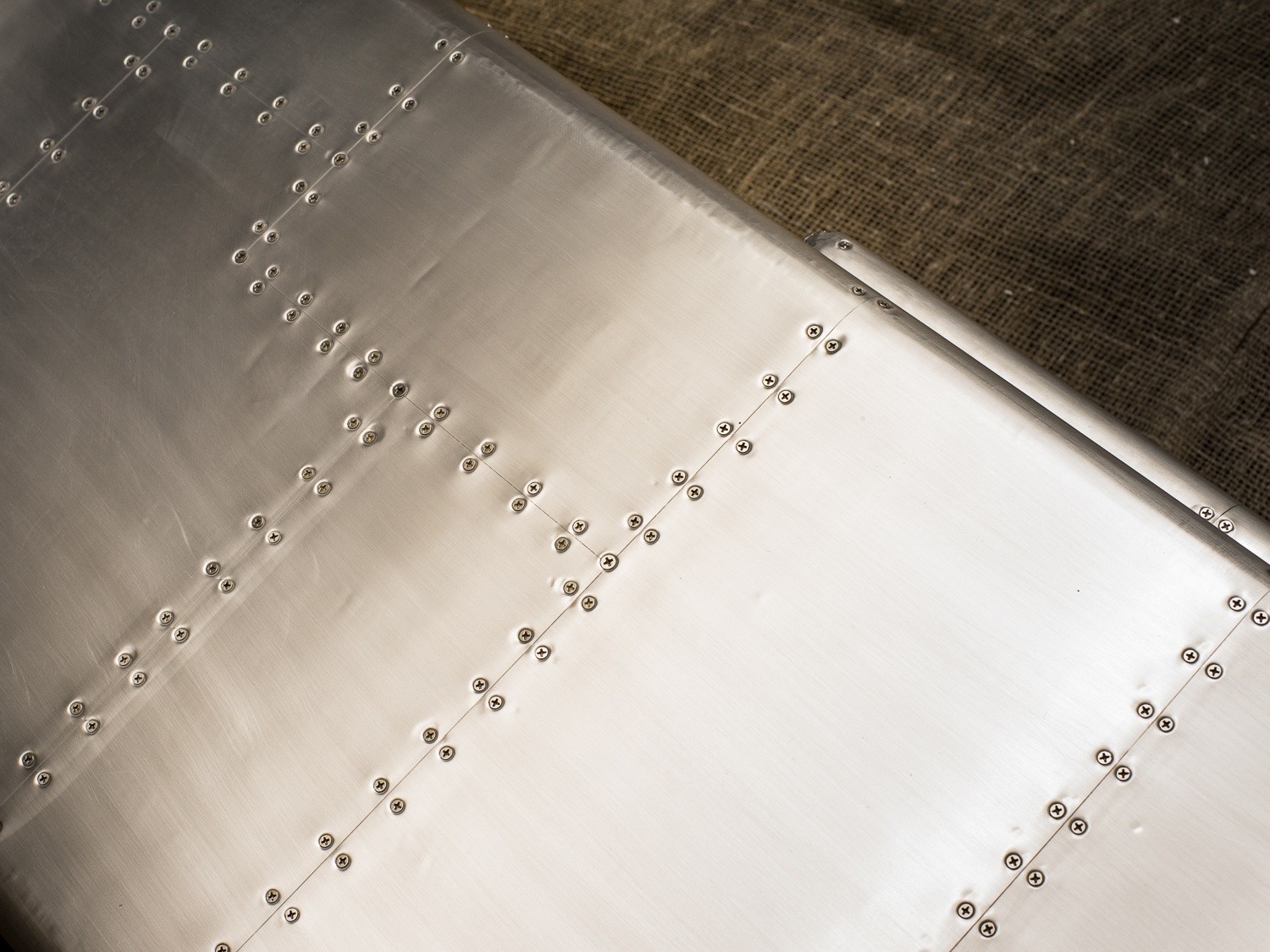 Каркас из натурального дерева обит алюминием, что придаёт конструкции дополнительную прочность и современной эстетики. Стальная отделка и текстильная подкладка завершают образ, идеально вписываясь в любые стилистические решения от индустриального до минималистичного.