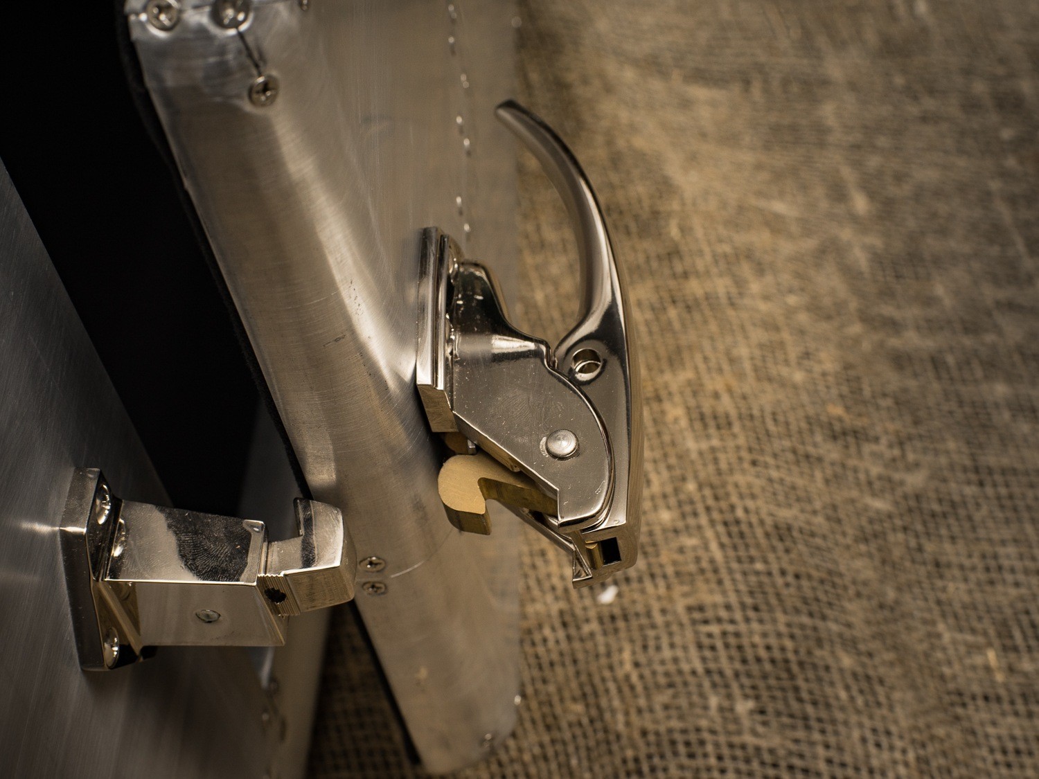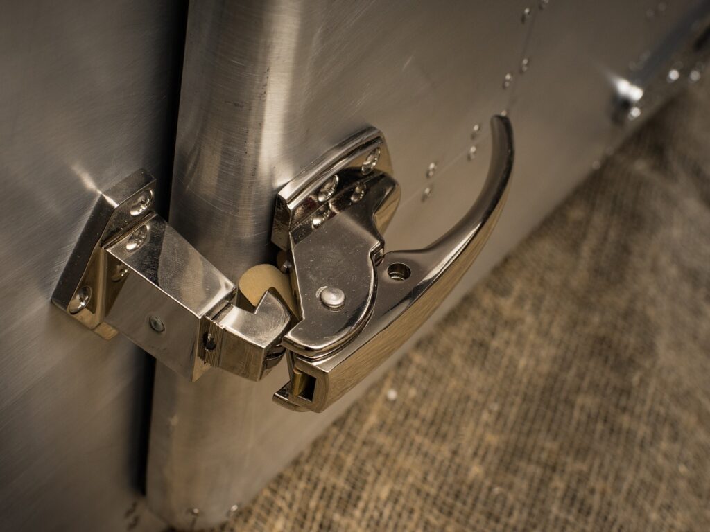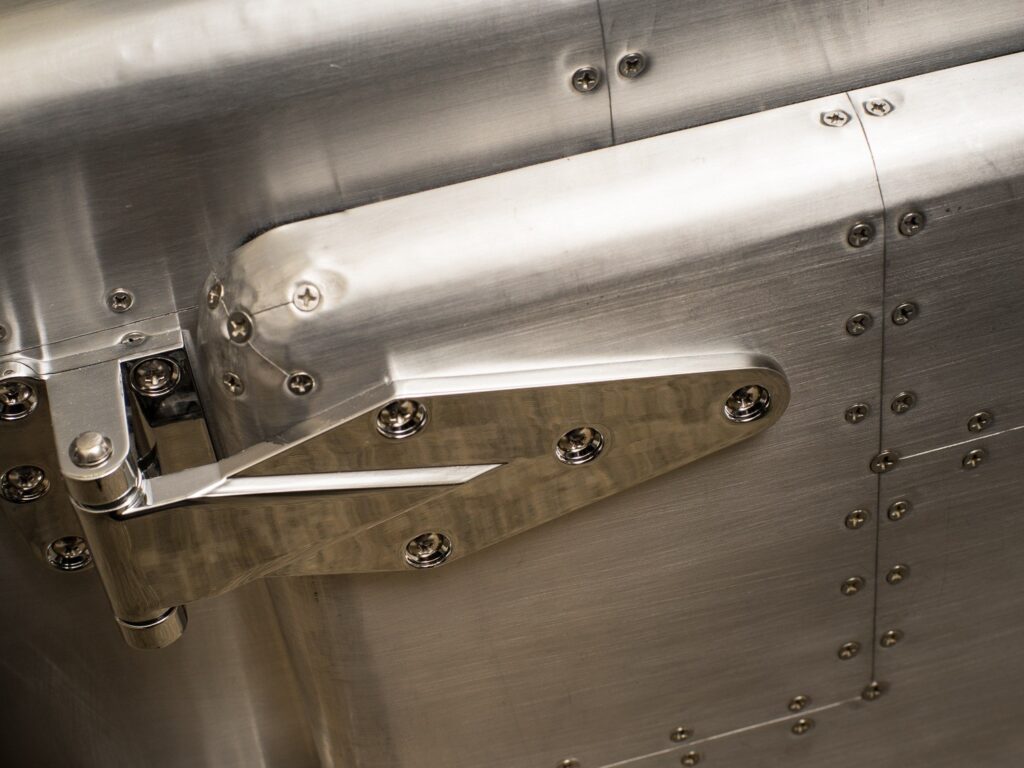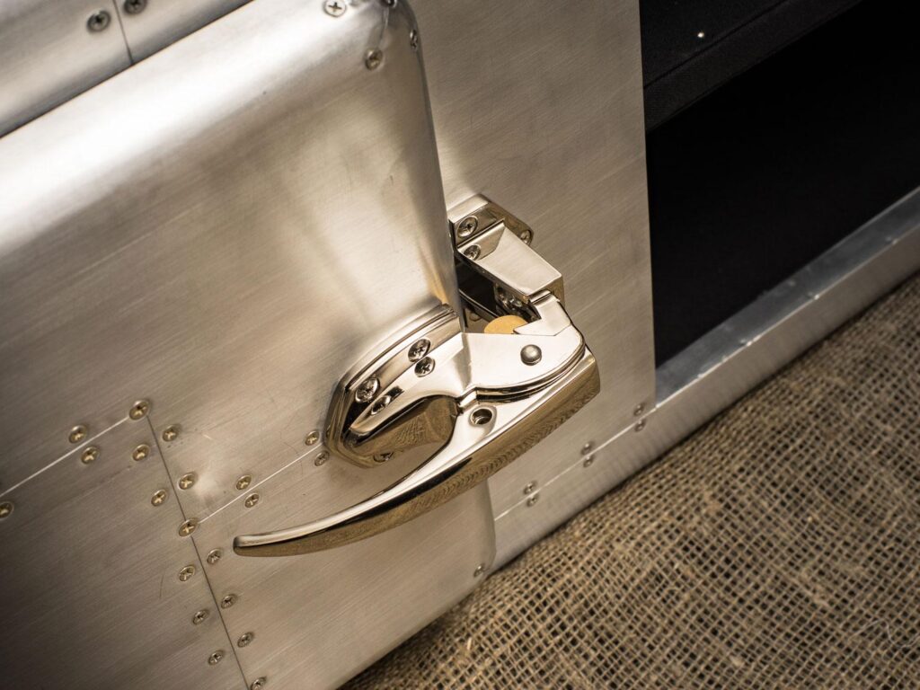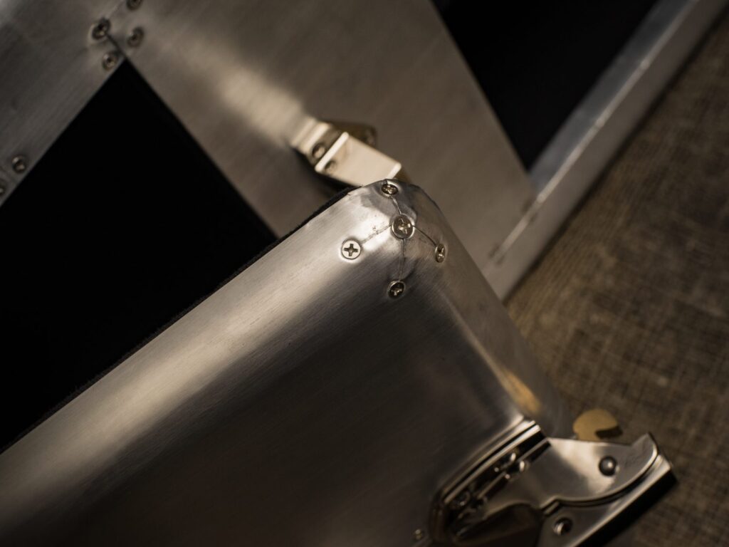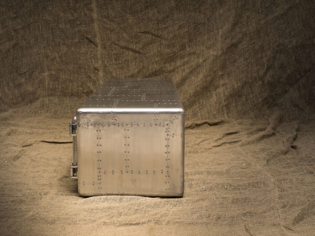 Каркас из натурального дерева обит алюминием, что придаёт конструкции дополнительную прочность и современной эстетики. Стальная отделка и текстильная подкладка завершают образ, идеально вписываясь в любые стилистические решения от индустриального до минималистичного.