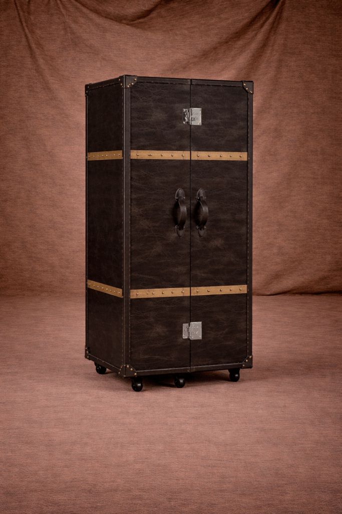 Изготовленный из качественного древесного каркаса с отделкой из натуральной кожи PU, этот винный шкаф не только прочен, но и выглядит потрясающе. Латунные акценты подчеркивают его изысканный дизайн, а массивные деревянные планки придают дополнительную стойкость и надежность. Стальная конструкция обеспечивает долговечность и стабильность, что делает этот шкаф идеальным выбором для ценителей хороших напитков.