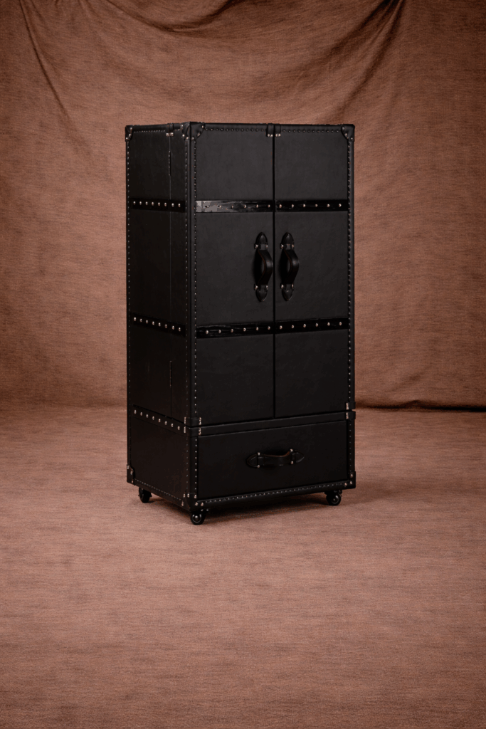 Эксклюзивный винный шкаф Wine Cabinet впечатляет искусным оформлением и дизайном. С его помощью можно удивить гостей не только редкими винными напитками, но и эффектной подачей. Деревянный каркас обит кожей черного цвета, декорирован клепаными деталями. Кожаные фигурные ручки дарят приятные тактильные ощущения. Верхняя часть распашного типа с полками и металлическими держателями. Внизу расположен выдвижной ящик для мелочей. Предмет мебели можно поставить в гостиную, кабинет, а также использовать в элитном баре и ресторане.